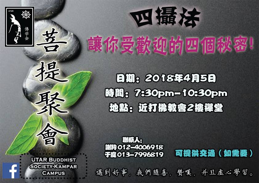 来,week 12的菩提聚会 让你放松身心,给自己一个机会这个学期就快结束之前,来共沾法喜,细心领会四摄法